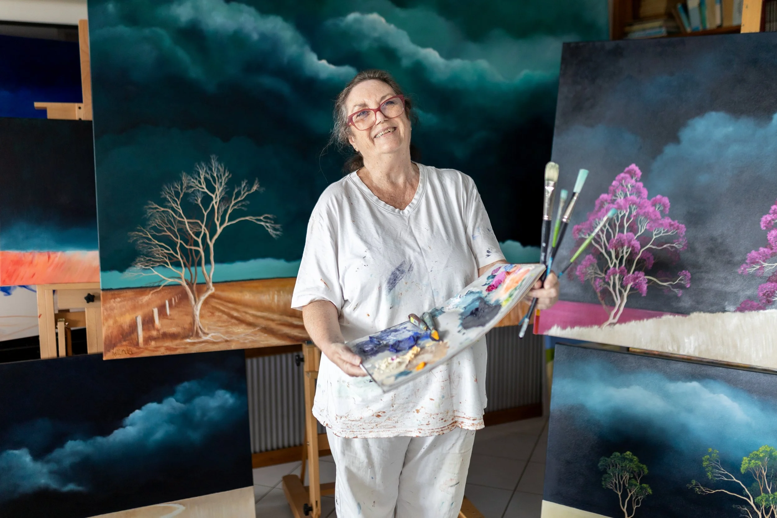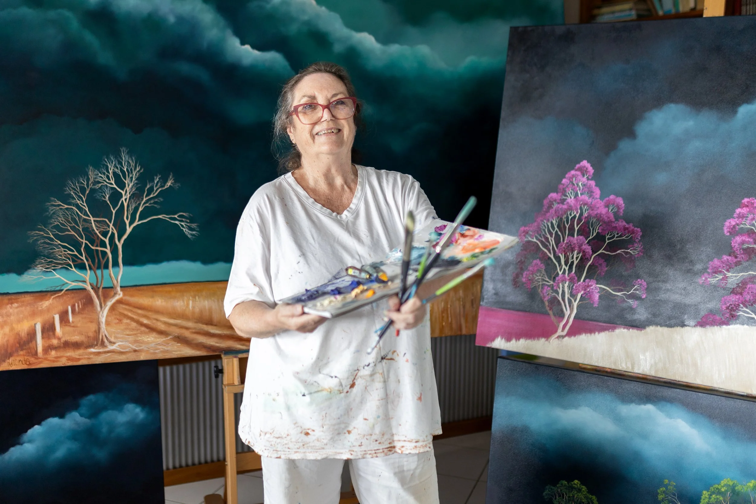Lucinda Leveille is a Queensland based artist whose evocative originals, spanning oils to watercolours, draw inspiration from sky, trees, and the emotional atmosphere of the landscape.